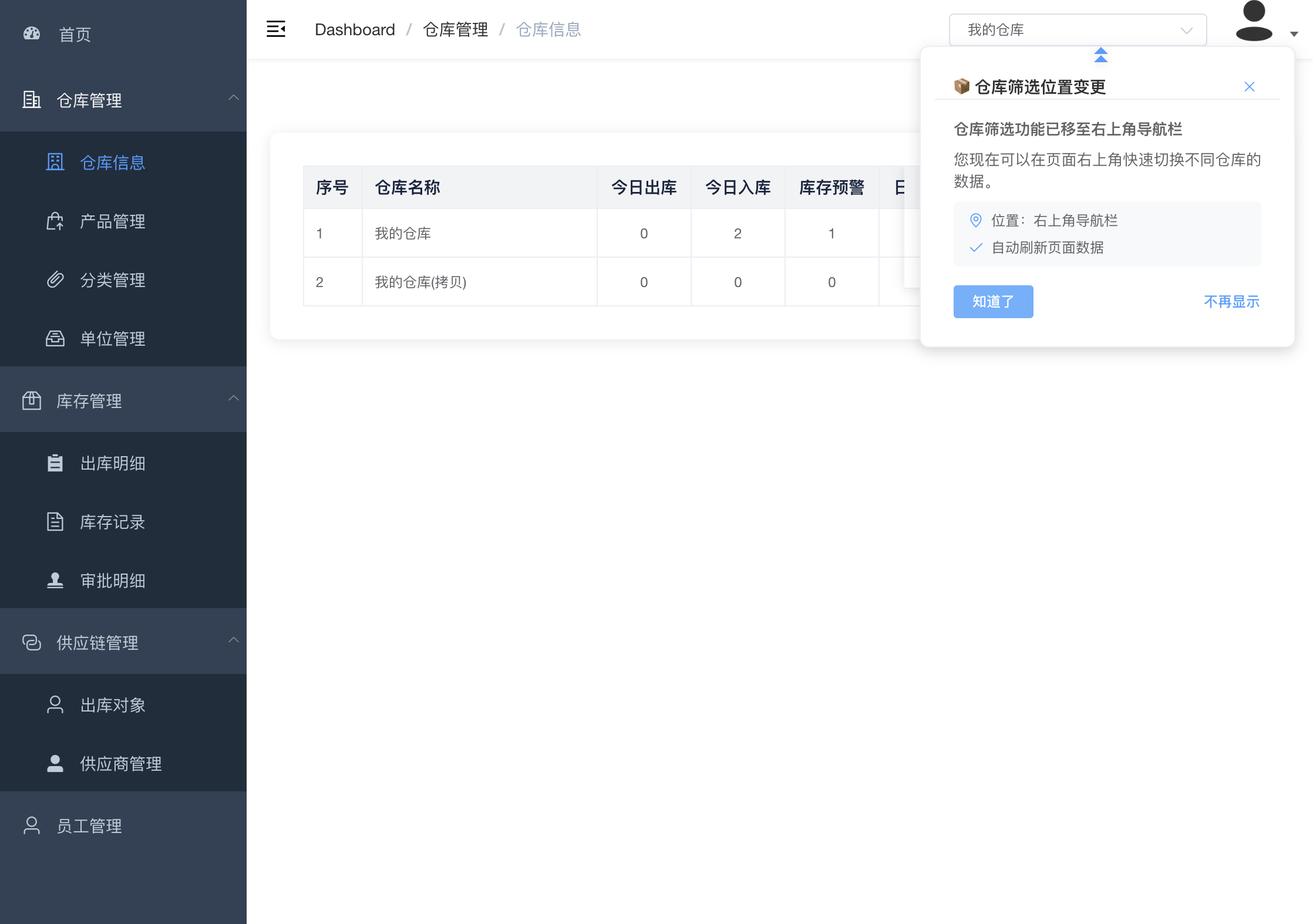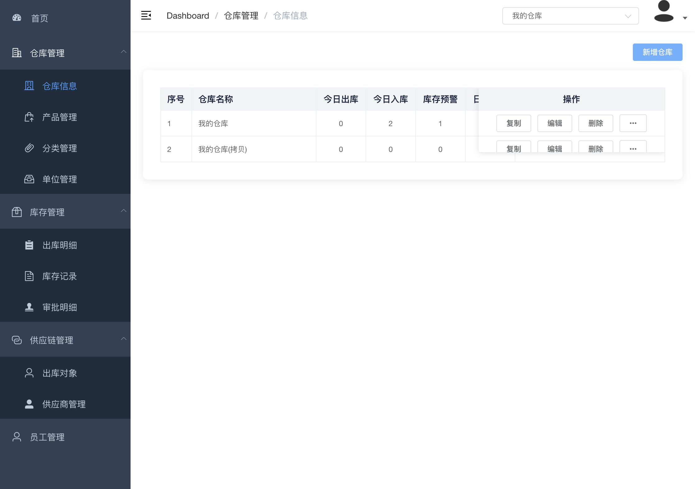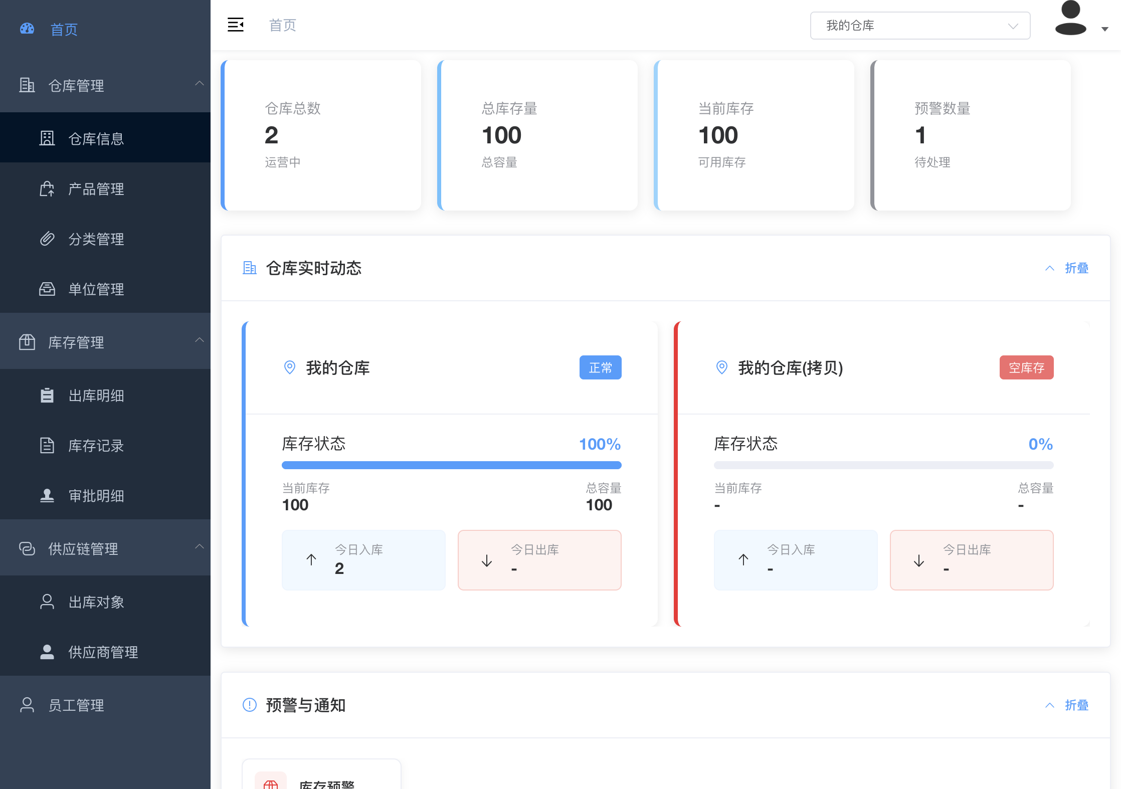 - 仓库列表:展示所有仓库(名称、今日出库、今日入库、库存预警、日期预警)