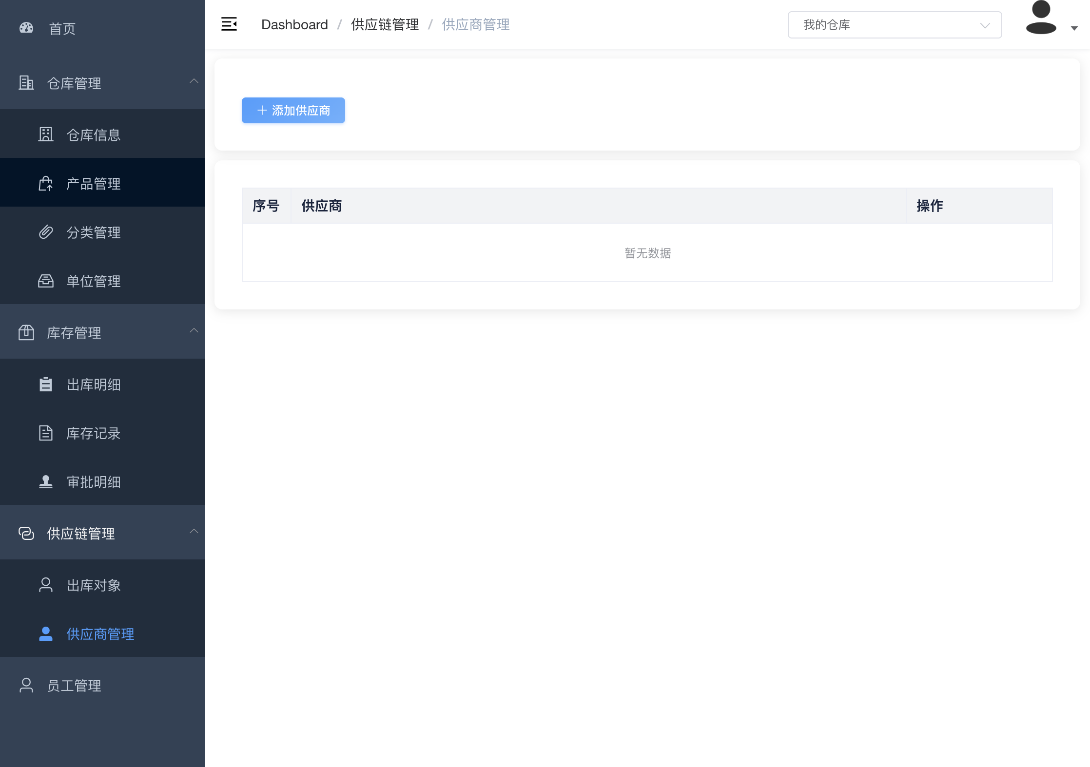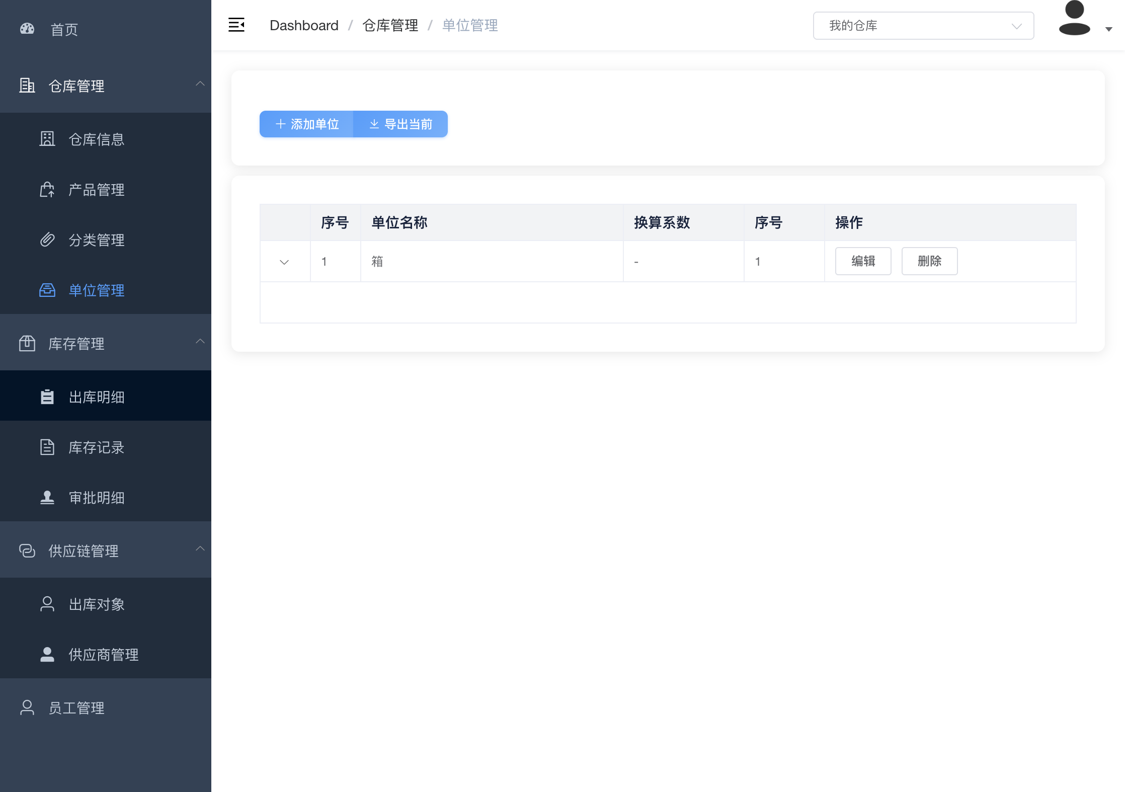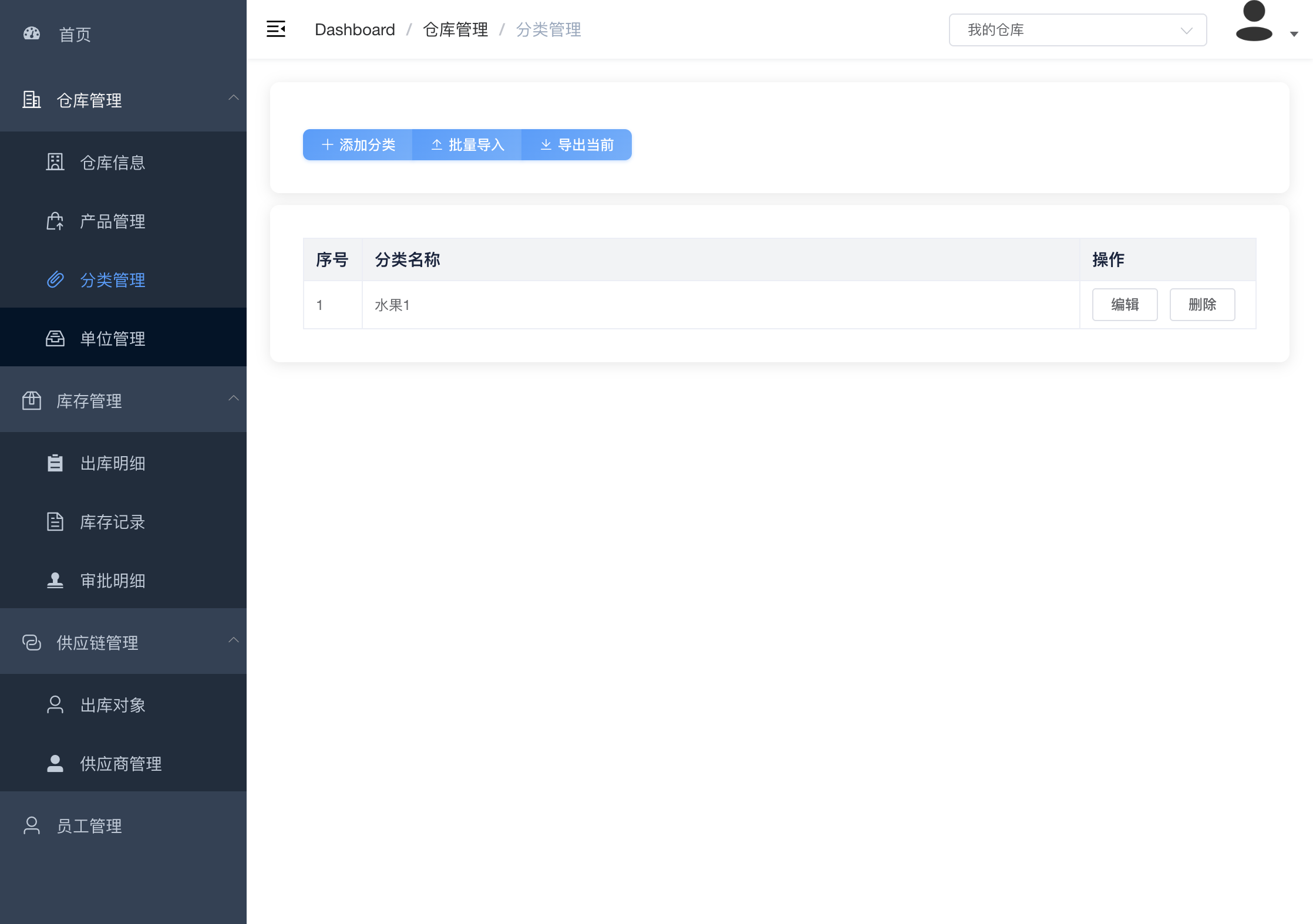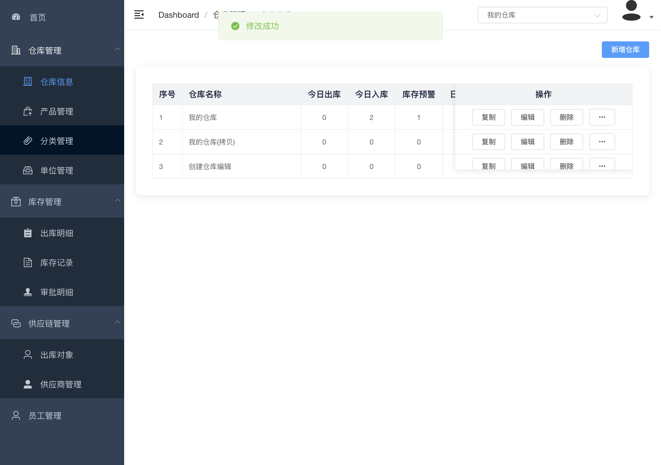 - 仓库列表:展示所有仓库(名称、今日出库、今日入库、库存预警、日期预警)