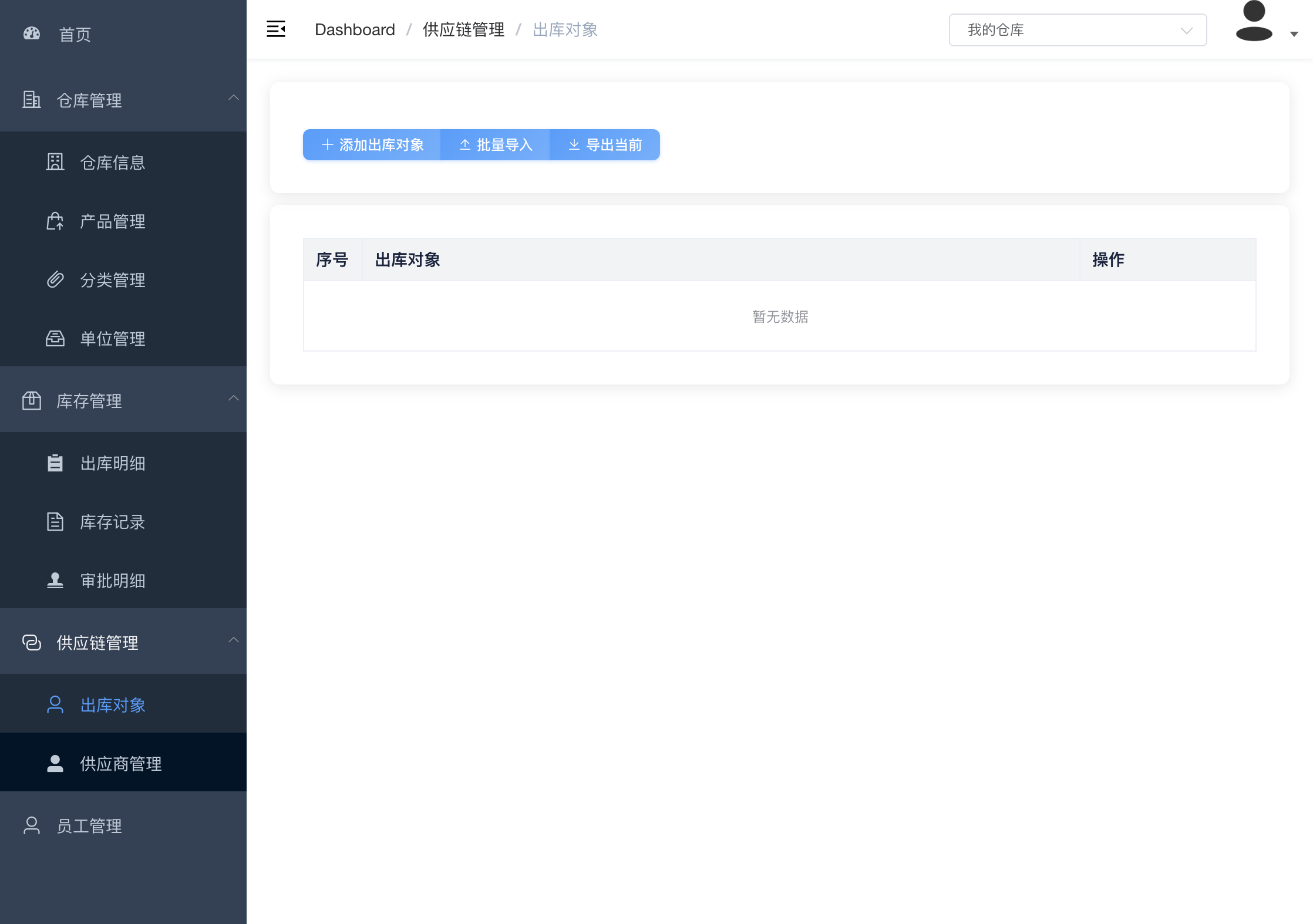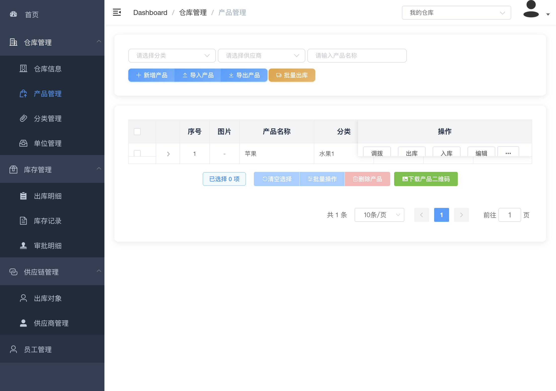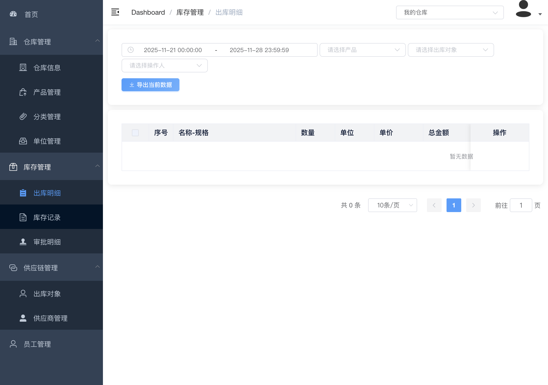 - 选择产品 → 选择规格 → 输入数量 → 设置出库单价 → 选择出库对象 → 提交出库