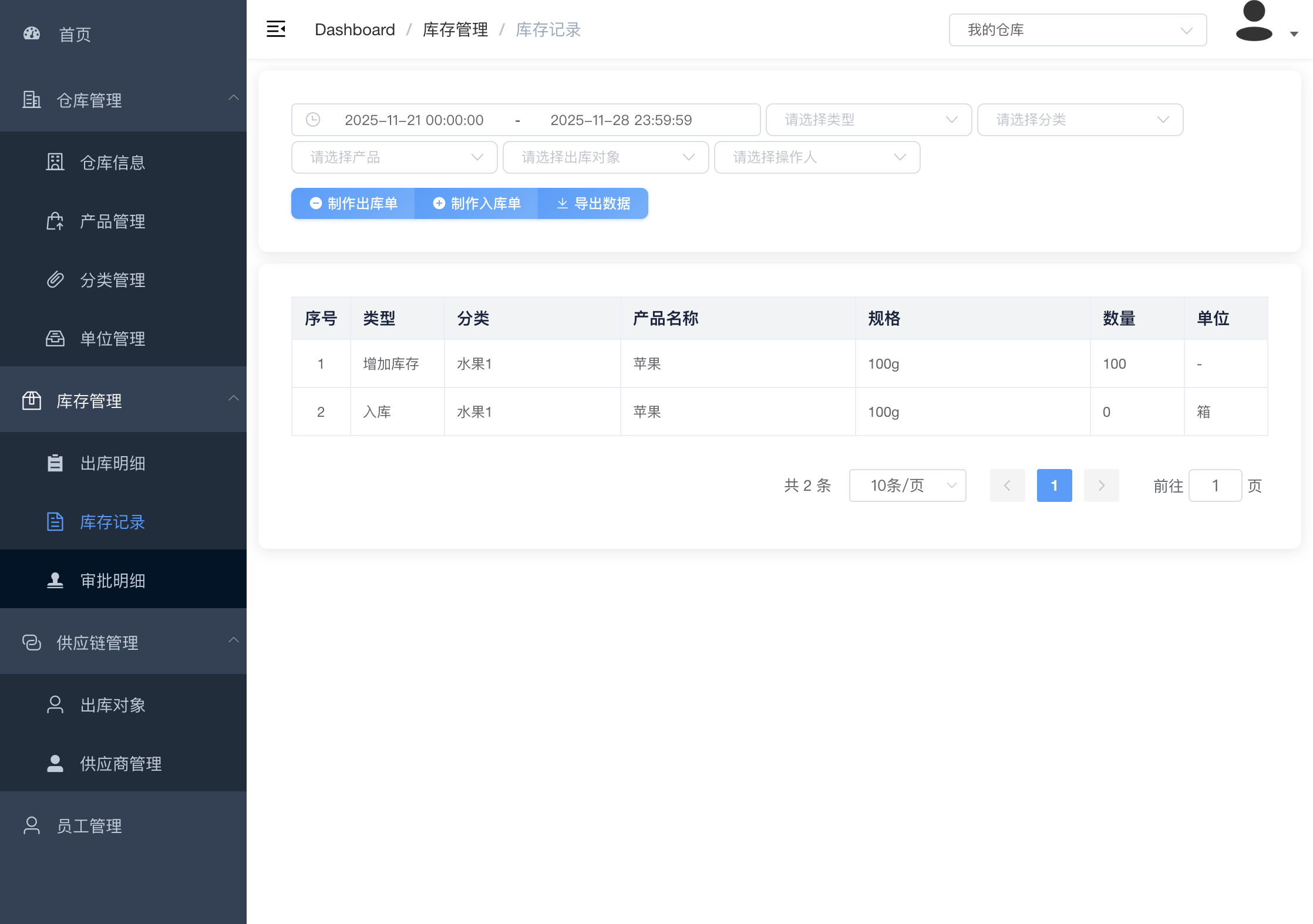 小微库存管理系统支持多仓库管理、产品管理、库存操作、审批流程、供应链管理、数据可视化等核心业务功能,提供细粒度的权限控制和完整的库存管理流程。